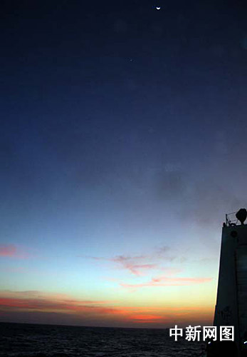 1月2日,中國海軍護航艦艇編隊繼續(xù)在印度洋航行,圖為航行途中在“海口”艦上所拍攝的印度洋晚霞映月景觀。 中新網(wǎng)記者 孫自法 攝