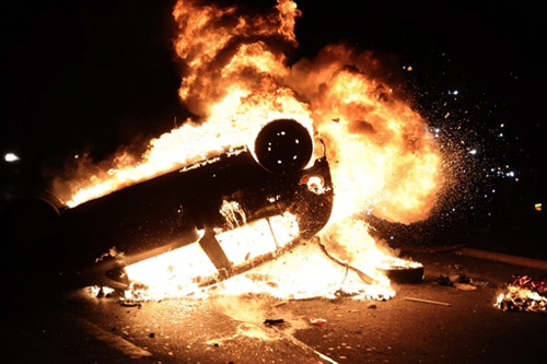 1月3日,在法國(guó)首都巴黎,一輛汽車在抗議以色列對(duì)加沙發(fā)動(dòng)襲擊的示威集會(huì)中被點(diǎn)燃。