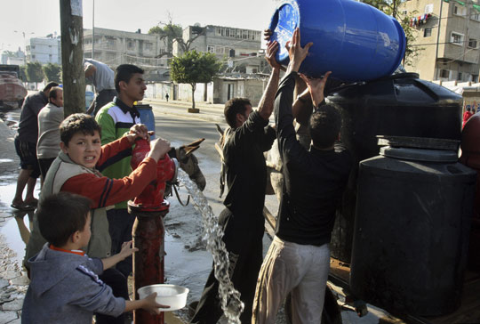 以色列軍方1月7日宣布,將從當天開始每天下午1點到4點;3小時,讓加沙地帶居民置備必需物品。圖為加沙居民在停火期間抓緊補充用水。