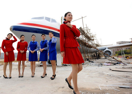 6名準空姐演示了自己在課堂上所學過的知識。