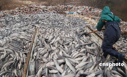 據(jù)工人王中友介紹,1月5日凌晨6時(shí),按常規(guī)尋塘?xí)r,發(fā)現(xiàn)每個(gè)魚池內(nèi)的鯰魚全部沉入了水底。中午11時(shí)左右,沉入水底的鯰魚一個(gè)個(gè)漂在水面,大片死魚漂滿了魚池,死亡數(shù)占95%以上。從1月5日中午開始,汪功兵組織近20人將死魚從魚池中撈上,用兩臺(tái)汽車向外裝運(yùn)。目前每天只能處理5萬斤死魚,大概需要一周時(shí)間才能清理完畢。
