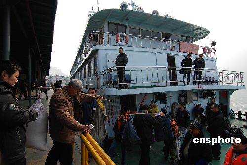 2009年1月8日,在三峽重慶庫區(qū)云陽縣港務(wù)站碼頭,旅客乘船出行。長江航務(wù)部門近日傳出消息,今年春運(yùn)三峽庫區(qū)將投入跨省客船109艘、43115個客位,預(yù)計(jì)春運(yùn)期間跨省運(yùn)送旅客42萬人次。有關(guān)部門將在1月10日前完成參運(yùn)船舶的安全檢驗(yàn)。中新社發(fā) 劉小洋 攝