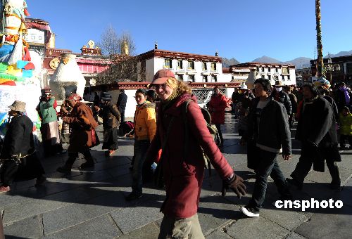 圖:外國游客愉悅游覽拉薩大昭寺廣場