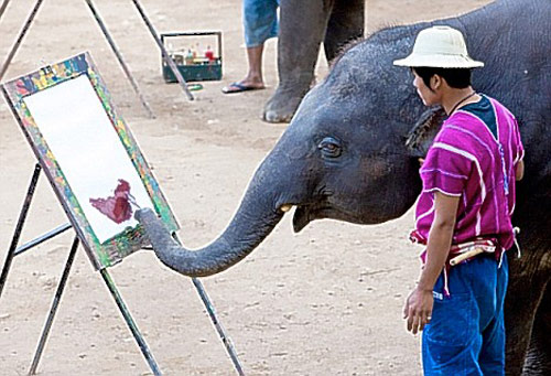 據(jù)英國媒體9日報道,泰國清邁有一群有藝術(shù)細胞的動物,11歲的亞洲象Lankam是其中一員,它已經(jīng)創(chuàng)作了數(shù)百幅繪畫作品,最貴的一幅畫甚至賣到2萬英鎊。