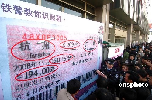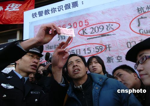 2009年1月10日,杭州鐵路公安處民警在杭州火車站售票處廣場教旅客識別真假火車票。春運期間,杭州鐵路警方針為了防止旅客群眾特別是眾多農民工朋友在購票過程中上當受騙,根據假火車票的原型同比放大50倍制作成假票宣傳展板,在杭州火車站前教授旅客識假票知識。中新社發(fā) 施健學 攝