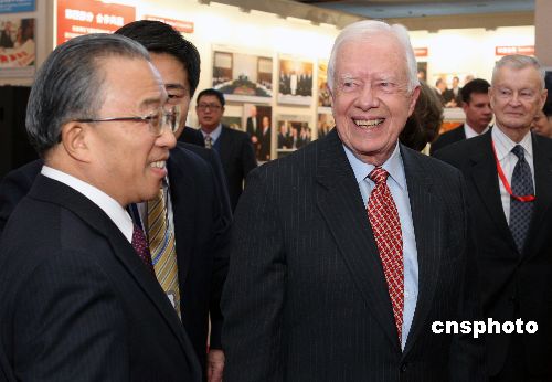 1月12日,中國國務委員戴秉國在北京陪同來訪的美國前總統(tǒng)吉米·卡特先生,參觀中美建交30周年圖片展覽,重溫兩國建交歷史。中新社發(fā) 宋吉河 攝