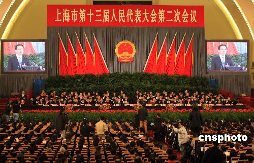 一月十三日上午九時(shí),上海市第十三屆人民代表大會(huì)第二次會(huì)議在上海展覽中心中央大廳開幕。上海市長(zhǎng)韓正代表市政府向大會(huì)作政府工作報(bào)告。中新社發(fā) 湯彥俊 攝