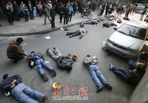 2009年1月13日上午10時30分許,記者在抓捕現(xiàn)場看到,廣東佛山禪城區(qū)城巴總站出站口有20名被控制住的嫌疑人橫七豎八地躺在地上。 張由瓊 攝