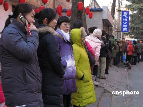 1月15日晨,北京西城區(qū)百萬莊南街,一飛機(jī)票火車票銷售點(diǎn)門前,欲購票的群眾在嚴(yán)寒中已排起長(zhǎng)龍等待開門營(yíng)業(yè)。春節(jié)前夕,假期返鄉(xiāng)回家過年客流出現(xiàn)高峰,最為緊俏的火車票一票難求。中新社發(fā) 鄒憲 攝