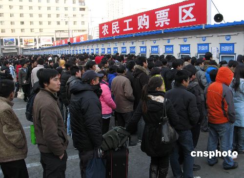 1月15日,北京西站廣場春運農民工售票窗口前,成千旅客提前多天排隊購買返鄉(xiāng)列車票,購票秩序良好。北京西站迎來春運“農民工返鄉(xiāng)流、學生流、探親流”的客流高峰,預計春運期間每天到發(fā)旅客列車約280多列,客流高峰時可達20萬人次,平均每五分鐘發(fā)一趟列車。中新社發(fā) 鄒憲 攝