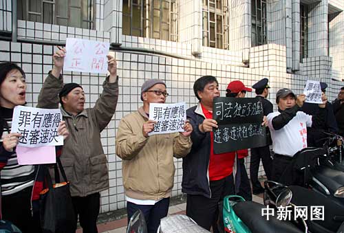 1月19日,臺(tái)北地方法院首次開(kāi)庭審理前臺(tái)灣地區(qū)領(lǐng)導(dǎo)人陳水扁家弊案。傳訊陳水扁到地院準(zhǔn)備程序庭。有臺(tái)灣民眾今天在地院對(duì)面舉牌寫(xiě)著“罪有應(yīng)得”。作者:陳立宇