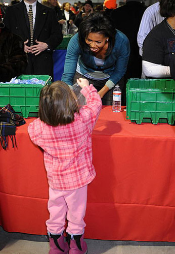 馬丁·路德·金全國紀(jì)念日,奧巴馬的夫人米歇爾在華盛頓的一個體育館內(nèi)幫助一名小志愿者。