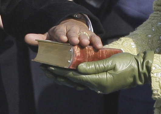 1月20日,美國當(dāng)選總統(tǒng)奧巴馬在美國國會大廈西側(cè)的露天平臺上正式宣誓就任美國第44任總統(tǒng),他宣誓所用的圣經(jīng)是林肯總統(tǒng)所用的。林肯是一百五十多年前結(jié)束美國黑奴歷史的總統(tǒng)。