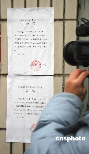 圖為法院門口張貼關于下午兩點開庭宣判三鹿集團及田文華等生產(chǎn)、銷售偽劣產(chǎn)品一案和張玉軍、張彥章以危險方法危害公共安全案的公告。中新社發(fā) 翟羽佳 攝