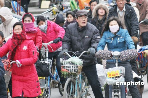 2009年1月22日,江蘇省贛榆縣市民在寒風(fēng)中出行。受強(qiáng)冷空氣東移南下影響,江蘇全省迎來(lái)強(qiáng)降溫寒潮天氣,蘇北沿海溫度最低降至零下8攝氏度以下,風(fēng)力9~10級(jí)。當(dāng)?shù)貧庀蟛块T(mén)發(fā)布寒潮黃色預(yù)警信號(hào),并提醒有關(guān)單位和個(gè)人做好防寒保暖和防風(fēng)工作。中新社發(fā) 司偉 攝