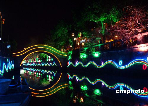 春節(jié)來臨,夜幕下的古城蘇州街頭流光溢彩,洋溢著節(jié)日氣氛。中新社發(fā) 王建康 攝