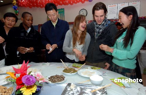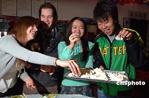 1月25日,農(nóng)歷大年三十。北京語言大學(xué)寒假留校的中國大學(xué)生與來自10個(gè)國家的40余名外國留學(xué)生、地震災(zāi)區(qū)的大學(xué)生歡聚一堂共慶新春。 中新社發(fā) 鄒憲 攝