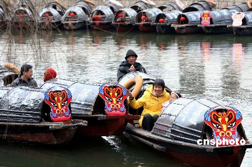 1月25日下午,浙江紹興東湖景區(qū)的烏篷船掛上牛頭圖,喜迎牛年到來(lái)。中新社發(fā) 袁云 攝