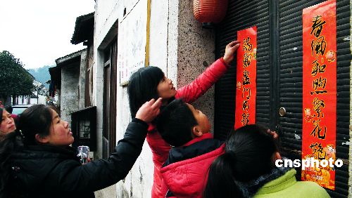 1月25日早晨,浙江紹興市區(qū)北海小學(xué)309班的學(xué)生們?cè)诶蠋煄ьI(lǐng)下,在市區(qū)西小路街頭送春聯(lián)。中新社發(fā) *李瑞昌* 攝