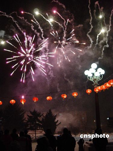 1月25日晚,農(nóng)歷除夕,中國兵器工業(yè)集團(tuán)齊齊哈爾建華公司在廣場舉行迎春秧歌焰火晚會(huì)。中新社發(fā) 王云龍 攝