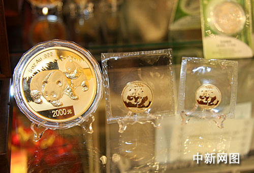 為紀(jì)念大熊貓團(tuán)團(tuán)、圓圓來臺(tái)與民眾見面。位于臺(tái)北市和平東路三段68——1號(hào)的臺(tái)灣大洋金銀幣有限公司特推出中國人民銀行發(fā)行的2008、2009年熊貓紀(jì)念金幣供臺(tái)灣民眾選購。中新社記者 陳立宇 攝