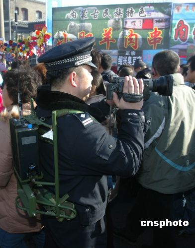 今年春節(jié),在北京的廟會(huì)上,市民可以看到背著“無線電小背包”,手拿攝像機(jī)“逛”廟會(huì)的警員。這是北京宣武警方首次將奧運(yùn)安保裝備運(yùn)用于廟會(huì)的安全保障。中新社發(fā) 湯亮 攝