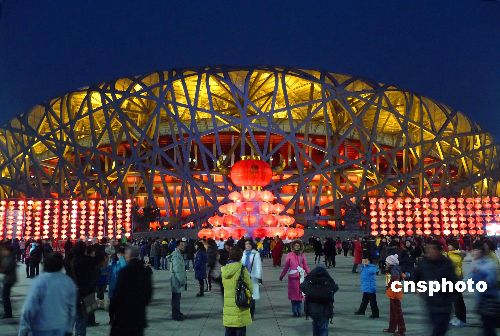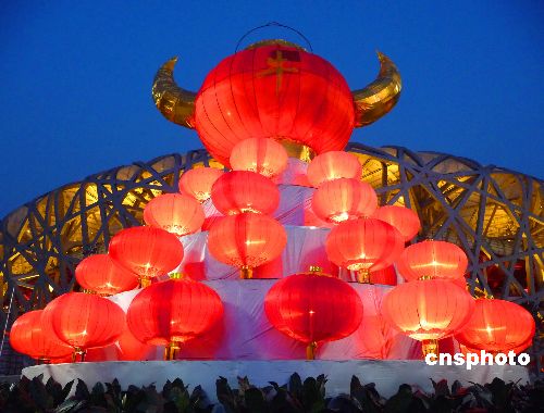 2009年1月31日傍晚,在北京奧林匹克公園中心區(qū)內(nèi),“金牛獻(xiàn)!、“年年有余”、“鴻福滿倉”等鋼材結(jié)構(gòu)的雕塑及數(shù)千個(gè)大紅燈籠,在牛年春節(jié)期間首次被安放在園區(qū)人流較集中的地方,與“鳥巢”、“水立方”交相輝映。中新社發(fā) 玉龍 攝