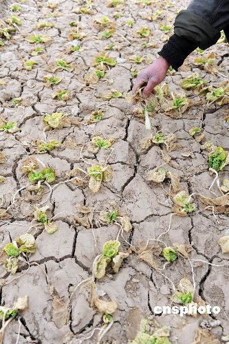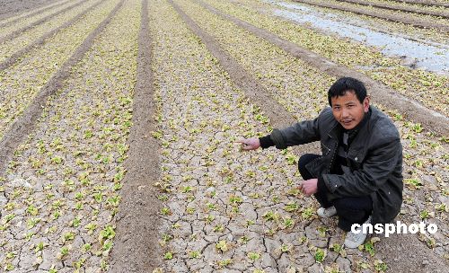 安徽省氣象臺近日發(fā)布干旱紅色預警,預計2月1日至8日,全省綜合氣象干旱指數(shù)達到特旱(氣象干旱為50年一遇),淮河以北地區(qū)將有60%以上的農(nóng)作物受旱。安徽省防汛抗旱指揮部近日也發(fā)布旱情1號通報。通報介紹,2008年10月下旬以來,全省合肥以北地區(qū),特別是淮北地區(qū)降雨嚴重偏少,發(fā)生嚴重旱情。據(jù)統(tǒng)計,全省受旱面積已達2417萬畝,其中嚴重受旱面積1200多萬畝。中新社發(fā) 張延林 攝