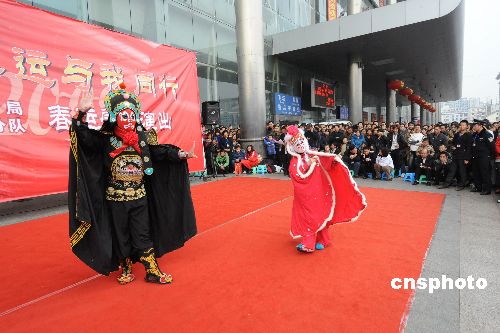 2009年2月3日,成都鐵路局文藝演出小分隊來到成都火車站進行慰問演出,為等候乘車的旅客們表演了歌舞、獨唱、川劇變臉等節(jié)目,祝大家愉快出行、一路順風(fēng)。中新社發(fā) 曹寧 攝