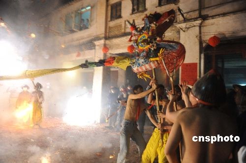 2月5日,農(nóng)歷正月十一,一場(chǎng)勇敢人的游戲——賓陽(yáng)炮龍節(jié)在廣西賓陽(yáng)縣舉行。代代起舞、終成獨(dú)特地方文化的賓陽(yáng)炮龍節(jié)已有一千多年歷史。2008年6月,炮龍節(jié)被列為第二批國(guó)家非物質(zhì)文化遺產(chǎn)名錄。舞炮龍時(shí),舞龍者頭戴藤帽,身系腰帶,赤膊上陣,任由鞭炮爆灼。龍到之處,各家各戶(hù)夾道歡迎,被喻為“中國(guó)狂歡節(jié)”。當(dāng)晚數(shù)萬(wàn)名游客觀賞。中新社發(fā) 蔣雪林 攝