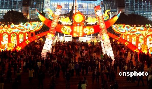 二月五日晚,為期五天的第三屆福州南后街元宵燈會在五一廣場、南后街同時正式亮燈,數(shù)百盞花燈呈現(xiàn)出濃濃的節(jié)日氣氛。圖為福州南后街元宵燈會五一廣場花燈展區(qū),一座50米長的大型門燈以及門燈后的“萬象更新”平安廊前人潮涌動,數(shù)萬市民絡(luò)繹不絕的到此觀賞獨(dú)具福州民俗特色的花燈。中新社發(fā) 劉可耕 攝