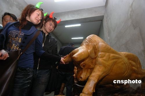 2月5日晚,一對戴著“牛角”的情侶共同摸一雕塑牛角祈求好運。牛年伊始,福州許多市民走上街頭游玩,看到牛造型的飾品都會摸之祈求好運。中新社發(fā) 王東明 攝