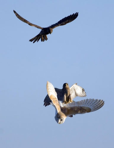 中新網(wǎng)2月6日電 據(jù)英國媒體5日報道,攝影師近日拍攝到了猛禽“空戰(zhàn)”的精彩照片。照片中顯示,一直谷倉貓頭鷹在白天覓食時遭到兩只茶隼的伏擊。