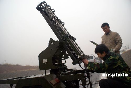 2月7日,河南濟(jì)源市為緩解旱情,密切關(guān)注天氣變化,抓住有利時(shí)機(jī),當(dāng)天下午在4個(gè)地點(diǎn)同時(shí)使用火箭和高炮進(jìn)行人工增雨作業(yè)。