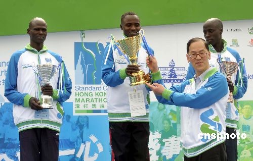 曾德成為香港馬拉松男子組三甲頒發(fā)獎杯。