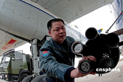 圖為空軍航空兵某師飛行人員認(rèn)真檢查飛機(jī)降雨作業(yè)裝置。中新社發(fā) 譚超 攝