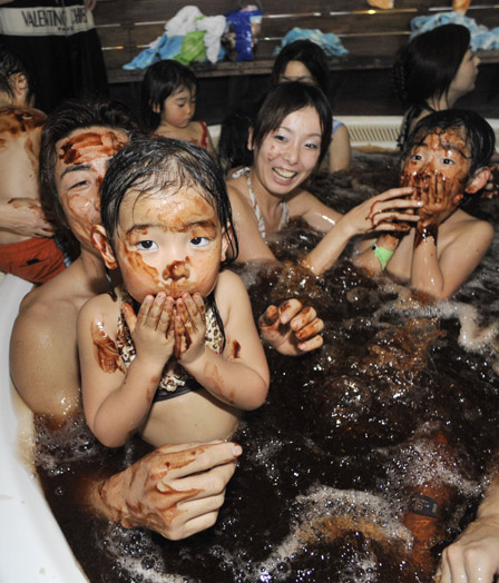 2月8日,游客們在日本神奈川縣享受奇特的“巧克力浴”。