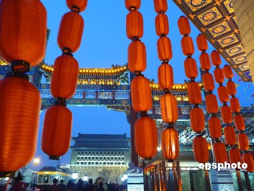 2009年2月8日,農(nóng)歷正月十四,千余盞大紅燈籠及中國(guó)結(jié)將北京前門大街妝扮出濃郁的節(jié)日氣氛。中新社發(fā) 玉龍 攝