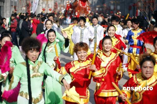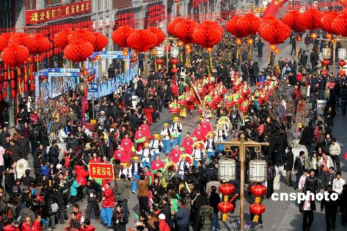 2月9日上午,來自北京、河北、山東等3個省市的12支花會隊,在前門大街舉行“傳統(tǒng)民間花會踩街”活動,喜迎正月十五元宵節(jié)的到來。踩街是一種中國傳統(tǒng)民間民俗藝術(shù)表演形式,類似國外的花車游行,表演隊伍邊行進(jìn)邊表演,游客沿途觀看;〞爮恼栭T箭樓南側(cè)和前門五牌樓出發(fā),16只南獅和北獅為大隊人馬開道,隨后中幡、旱船、二魁摔跤、地秧歌、鼓子秧歌等將依次向珠市口行進(jìn)。