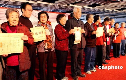 圖為在活動(dòng)上長(zhǎng)者們手捧政府當(dāng)年頒發(fā)的不同版本的結(jié)婚證相互祝福。中新社發(fā) 錢興強(qiáng) 攝
