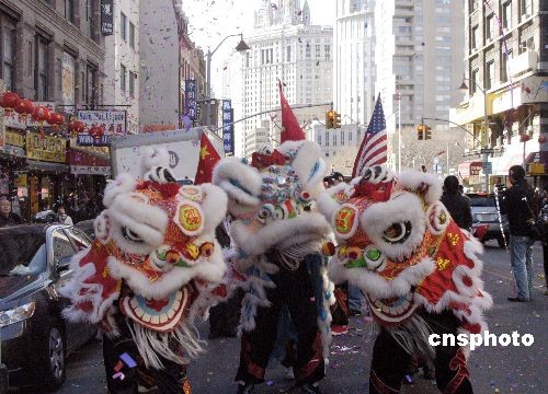 圖:紐約中國城醒獅游街鬧元宵