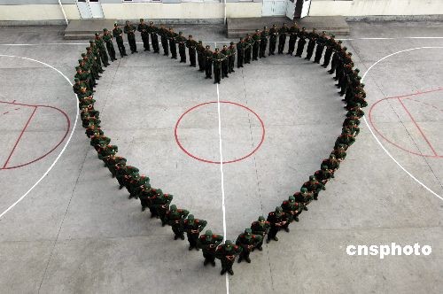 浙江溫州邊防支隊(duì)新兵連戰(zhàn)士們在籃球場上組成一個美麗的軍綠色“心”形圖案,給遠(yuǎn)方的父母和女友送去祝福。中新社發(fā) 吳水斌 攝