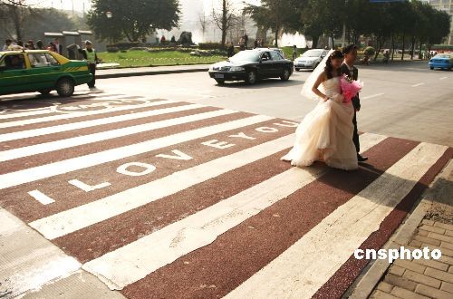 情人節(jié)前夕,位于成都市區(qū)的“愛情斑馬線”迎來了一對(duì)對(duì)新人。