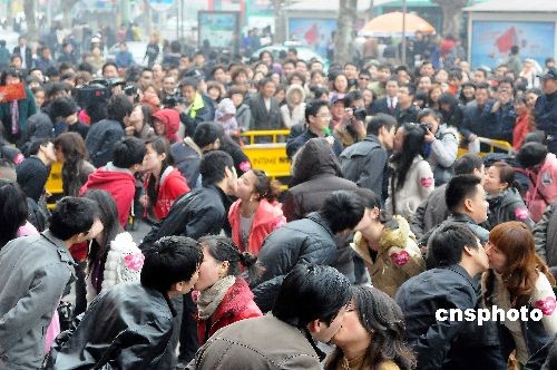 2月14日,杭州市首屆情人節(jié)“牛吻”大賽在武林銀泰、西湖銀泰、杭州百貨大樓三地同時舉行,活動吸引了80對情侶前來參加。中新社發(fā) 引煒 攝