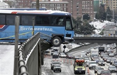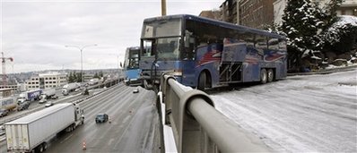當(dāng)?shù)貢r(shí)間19日,美國(guó)西雅圖市兩輛共載有約80名學(xué)生的巴士在公路上相撞,兩輛巴士都撞毀道路旁邊的圍欄,圍欄外10多米下就是一條公路。其中單層巴士車(chē)頭至前輪部分懸空,非常驚險(xiǎn)。