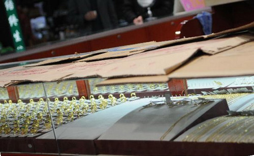 當(dāng)營業(yè)員招呼“顧客”時,四名嫌疑人瞅準(zhǔn)時機,迅速地將柜臺上的玻璃掀起,伸手將柜臺里的黃金手鏈、項鏈拿出裝入隨身帶的白色包內(nèi)。四人得手后迅速溜走。