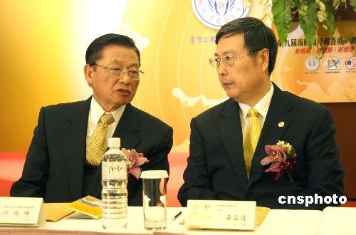 圖為臺灣海基會董事長江丙坤(左)與中華全國工商業(yè)聯(lián)合會主席黃孟復(fù)交談。中新社發(fā) 陳立宇 攝
