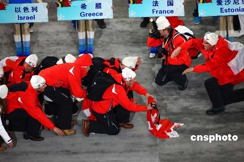 圖為在開幕式上瑞典代表團(tuán)以獨(dú)特的方式入場(chǎng)。中新社發(fā) 富田 攝