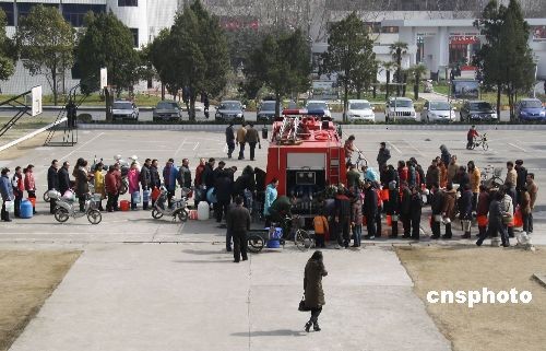 2月21日,江蘇省鹽城市各主干道上,消防車輛正為市民輸送安全用水,確保鹽城市民能夠安心喝上未被污染的自來水。由于水廠受酚類化合物污染,鹽城市區(qū)2月20日出現(xiàn)大面積停水,居民生活受到較大影響。造成本次停水的水源地污染原因已經(jīng)確認,偷排污水的鹽城標新化工有限公司被責令關閉,法人代表等相關責任人被采取強制措施。圖為鹽城市市委黨校內(nèi)前來取水的市民排成了長龍。中新社發(fā) 童盛 攝