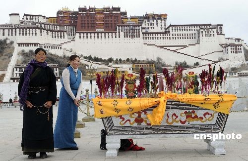 2月23日,拉薩布達(dá)拉宮廣場布置巨型“切瑪”迎接藏歷新年,F(xiàn)場這位藏族老阿媽稱這是她見過的最大的“切瑪”。藏歷新年時,藏族民眾家家戶戶供“切瑪”,人人都嘗“切瑪”。當(dāng)客人走進(jìn)藏民家時,主人首先會獻(xiàn)“切瑪”,客人從堆放在“缽”中的“切瑪”里拿出一點(diǎn)兒來,并說“扎西德勒”(吉祥如意之意),爾后放進(jìn)嘴里,預(yù)祝新春如意、身體康健。